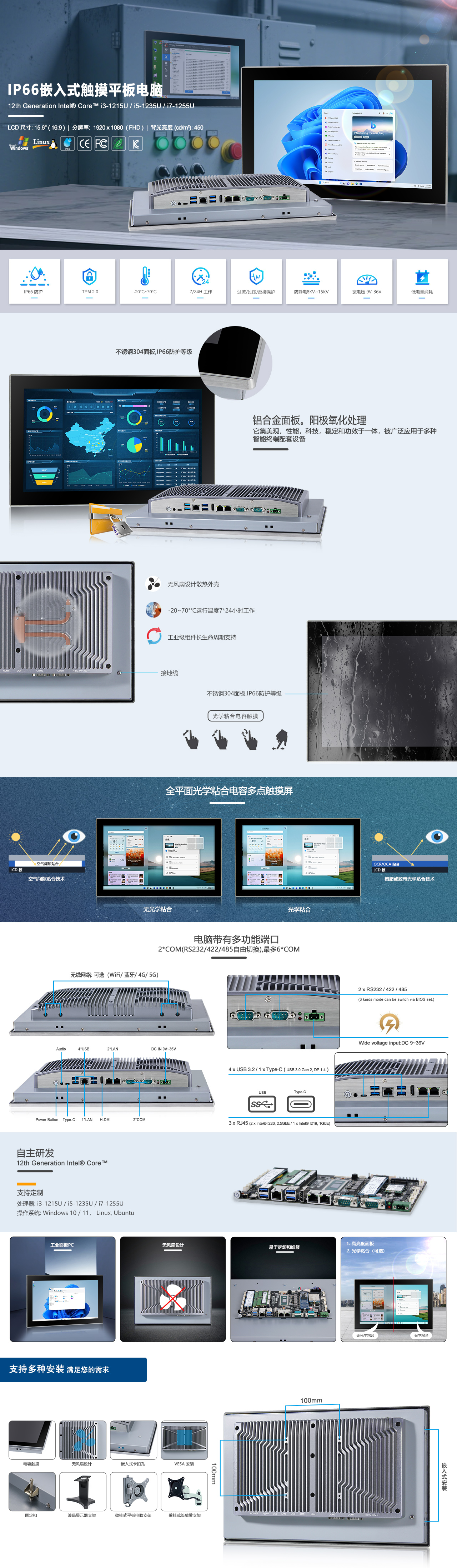 15.6寸液晶屏 / 分辨率 1920 x 1080 / 12th Gen Intel® Core™ i7-1255U 1.7GHz / 光学粘合电容触摸 / 1 x H-DMI / 3 x LAN / 4 x USB3.2 / 1 x Type-C / 2 x COM / TPM2.0 / DC 9V~36V 宽电压输入,支持过流,过压和反接保护 |