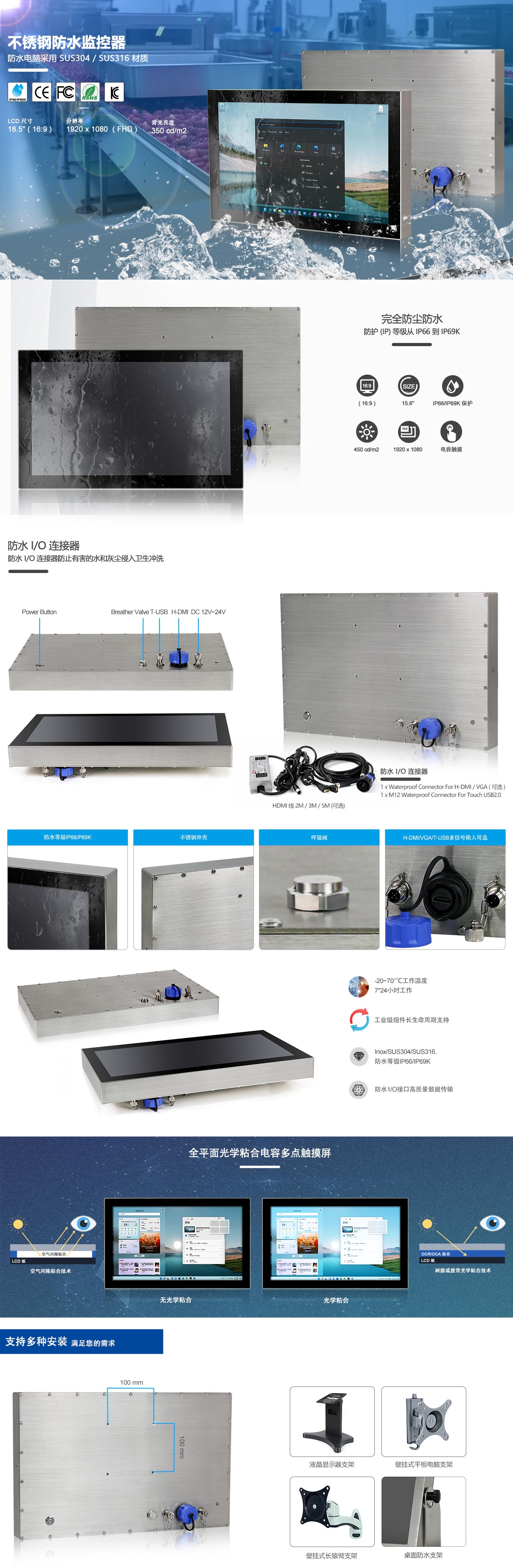 18.5" FHD LED / 分辨率1920x1080 / 光学贴合电容触摸 / 1 x H-DMI / 1 x T-USB / DC 12V~24V 宽压输入 |