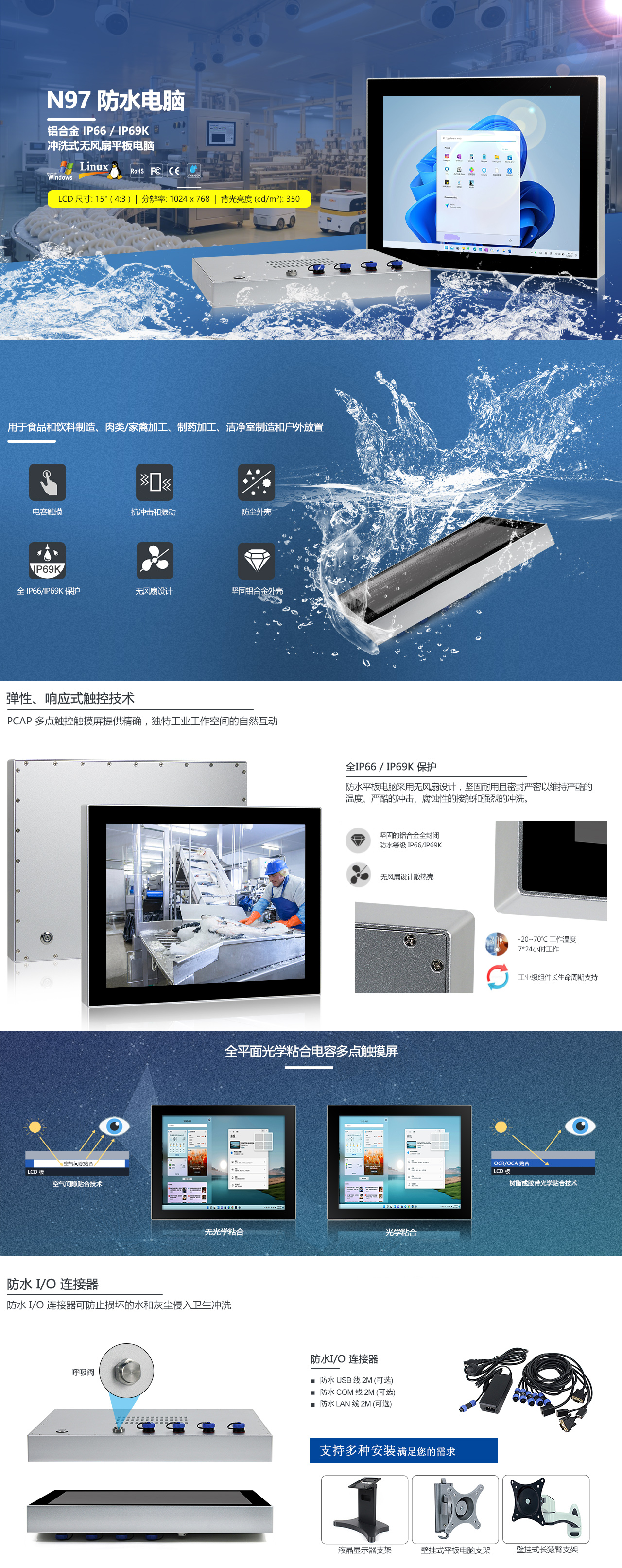15寸XGA液晶屏 / 分辨率1024 x 768 / Intel® Alder Lake-N N97 2.0GHz / 光学粘合电容触摸 / 2 x LAN / 1 x COM / 2 x USB / TPM2.0 / DC 9V~36V宽压输入, 支持过流、过压和反接保护 |