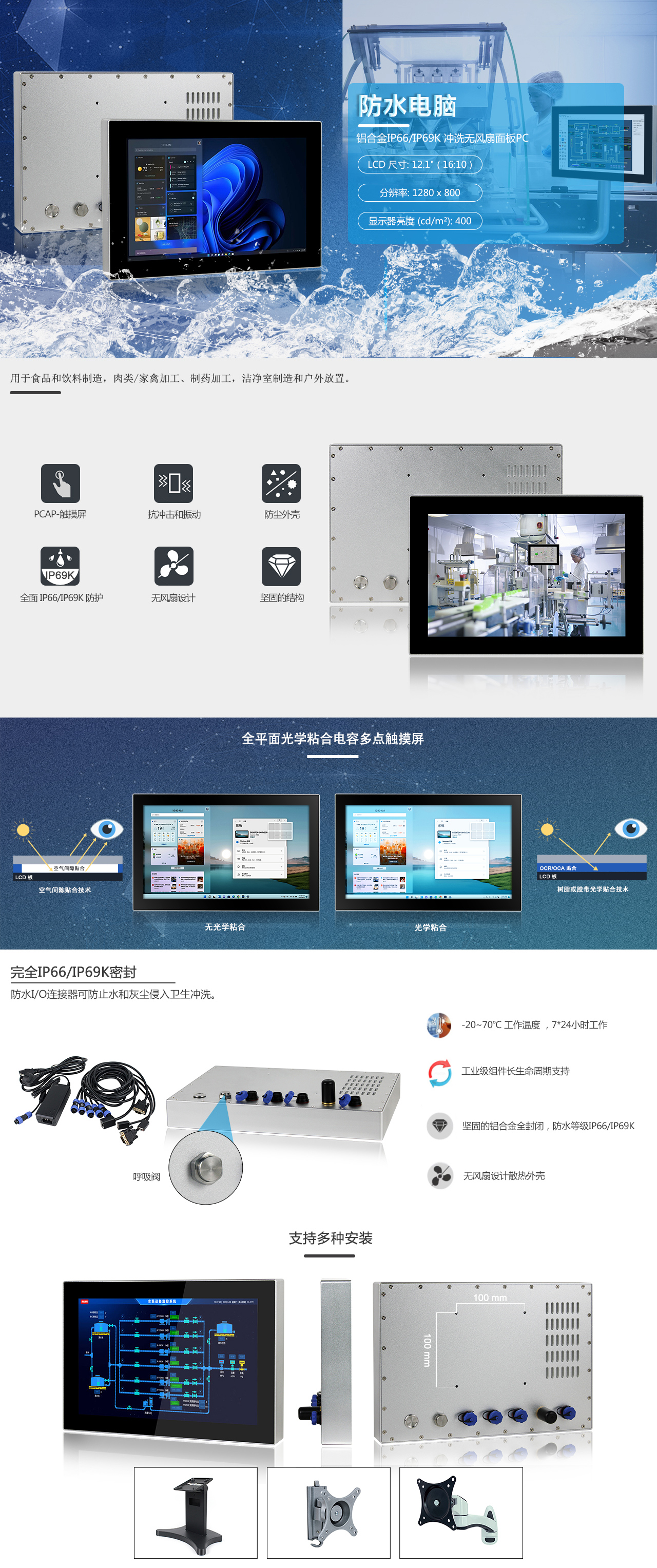 12.1寸液晶屏 / 分辨率1280 x 800 / 6th Gen Intel® Skylake Core i5-6200U 2.3GHz / 光学粘合电容触摸 / 2 x LAN / 1 x COM / 2 x USB / DC 12V~24V 宽压输入 |