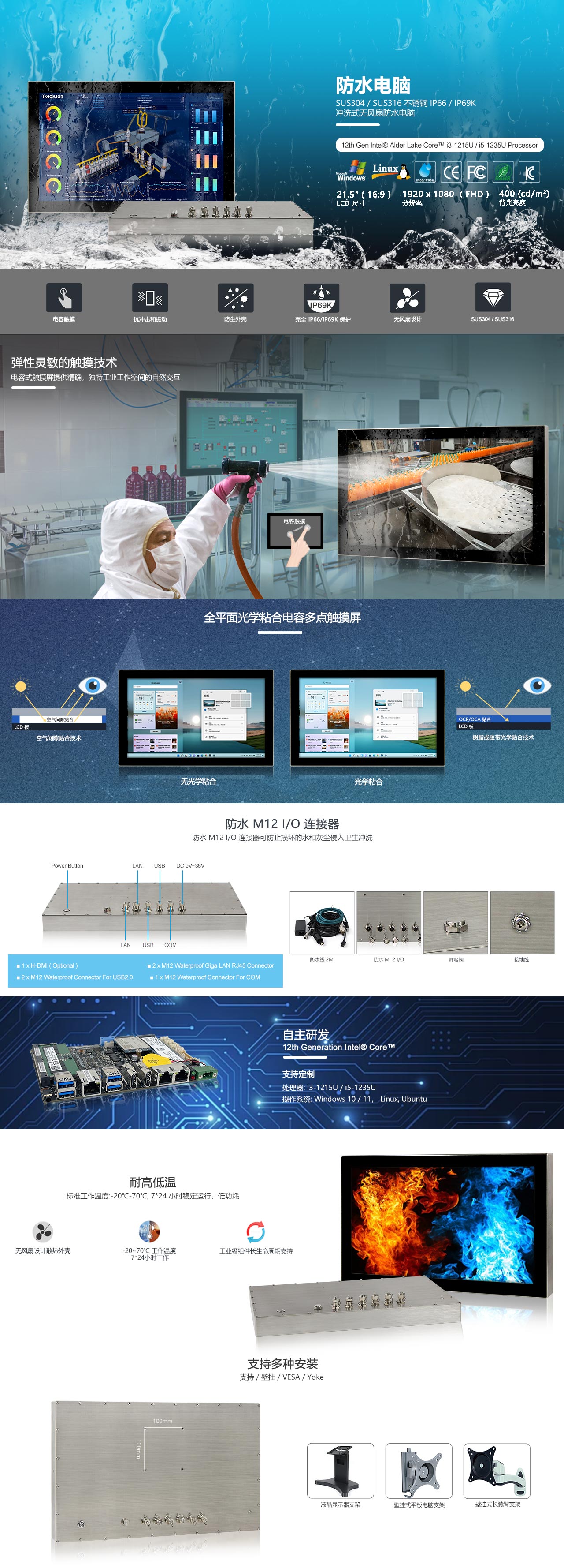 - 工业级21.5" FHD LCD屏,50k背光寿命